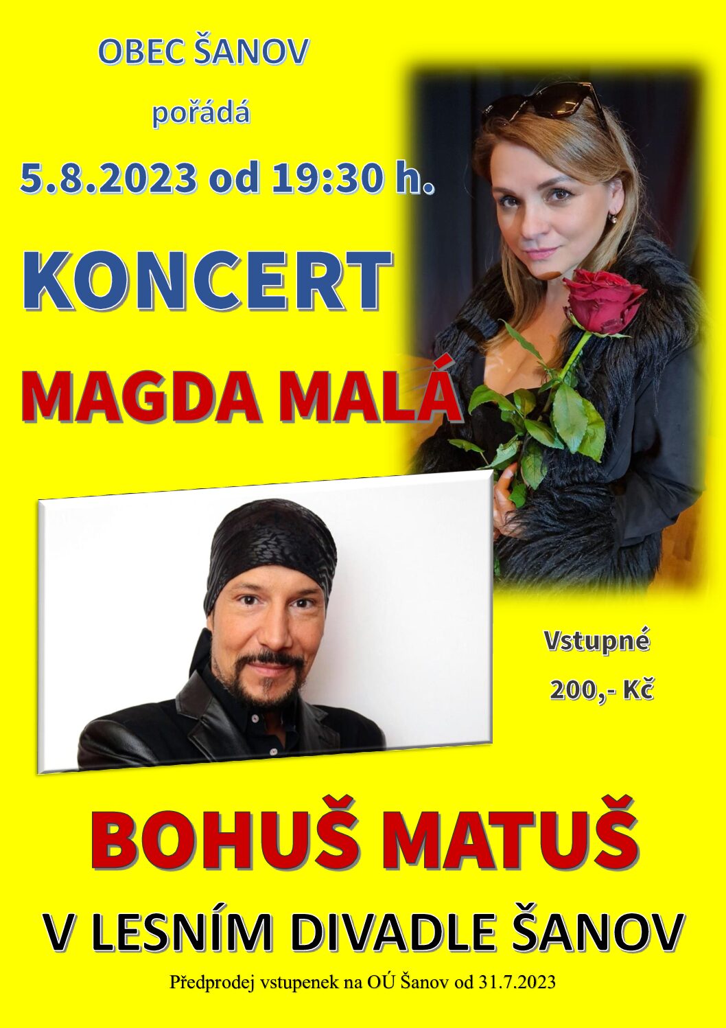 Šanov u Rakovníka – s Magdou Malou « Všechny Akce akce již proběhla. Šanov u Rakovníka – s Magdou Malou 5. 8. 2023 | 19:30 - 21:30 « Krásný Dvůr – s Magdou Malou Chorušice » + Kalendář Google+ Exportovat iCal Podrobnosti Datum: 5. 8. 2023 Čas: 19:30 - 21:30 Rubrika Akce: Vystoupení Webová stránka: https://www.obec-sanov.cz/aktualne/kalendar-akci/koncert-bohuse-matuse-a-magdy-male-365_220cs.html